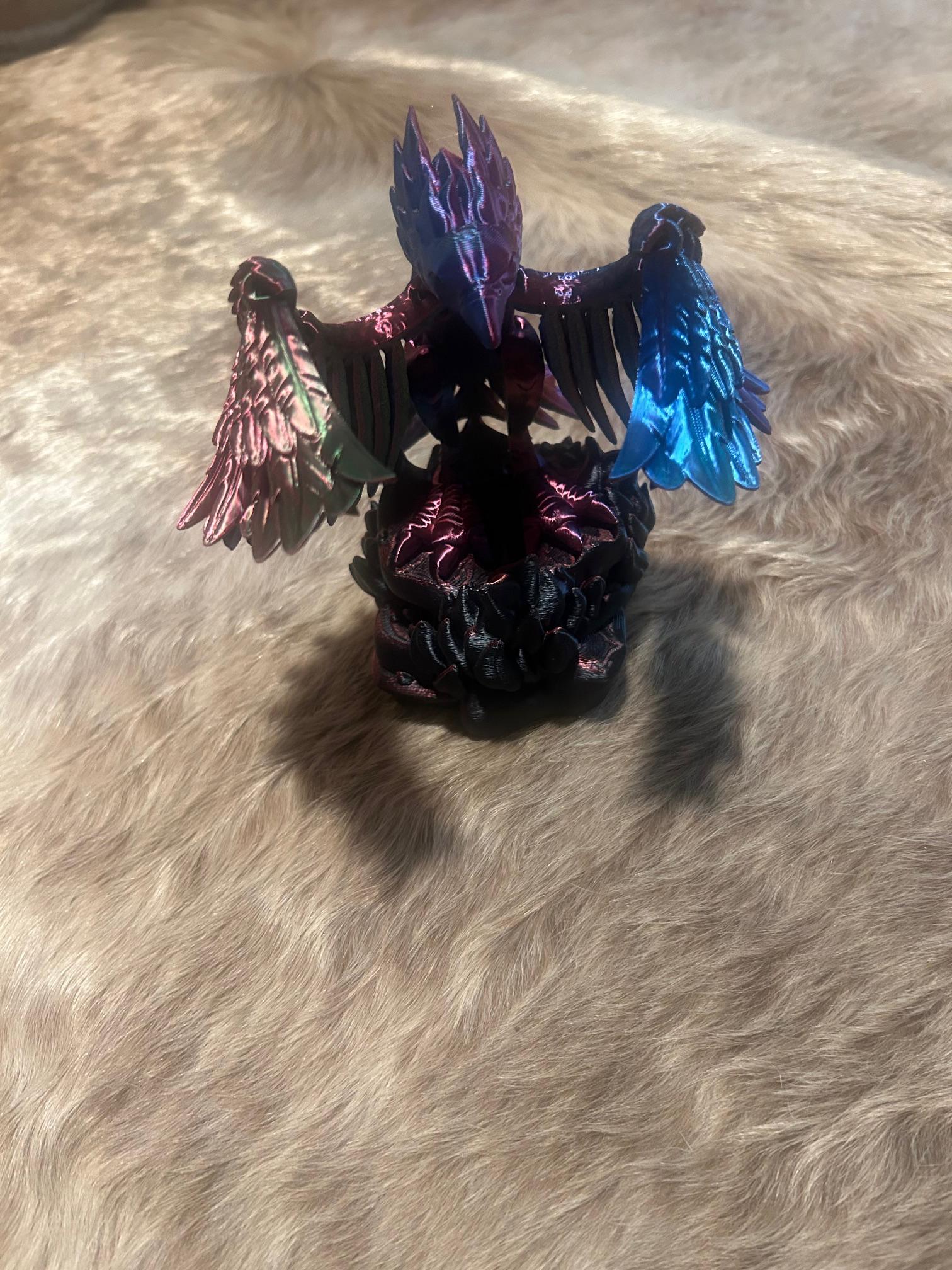 Rise from the ashes in style with this breathtaking articulated phoenix, handcrafted in shimmering silk filament that shifts between deep crimson, blue, and emerald hues. With detailed feathering, posable wings, and a graceful, serpentine body, this phoenix is more than decor — it’s a fidget toy, conversation piece, and fantasy collectible all in one.