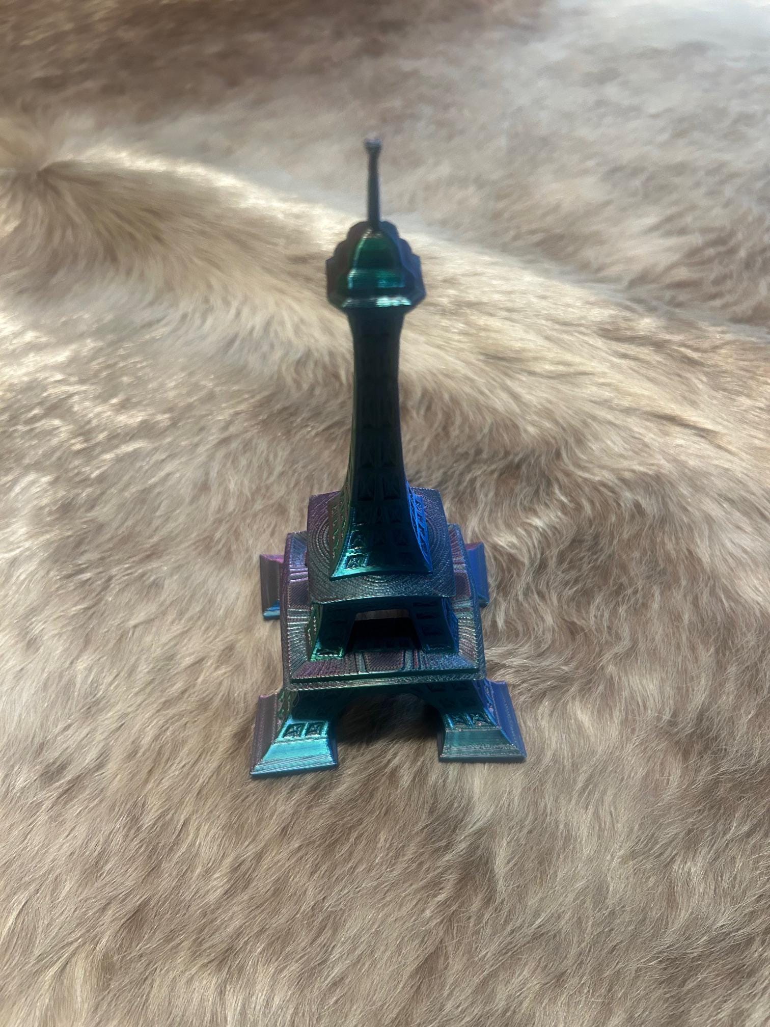 Bring a touch of Paris to your home with this stunning, color-shifting 3D printed Eiffel Tower replica! Designed with intricate detail and printed in a premium silk rainbow filament, this miniature landmark shimmers in vibrant shades of purple, green, and teal—changing as the light hits it.